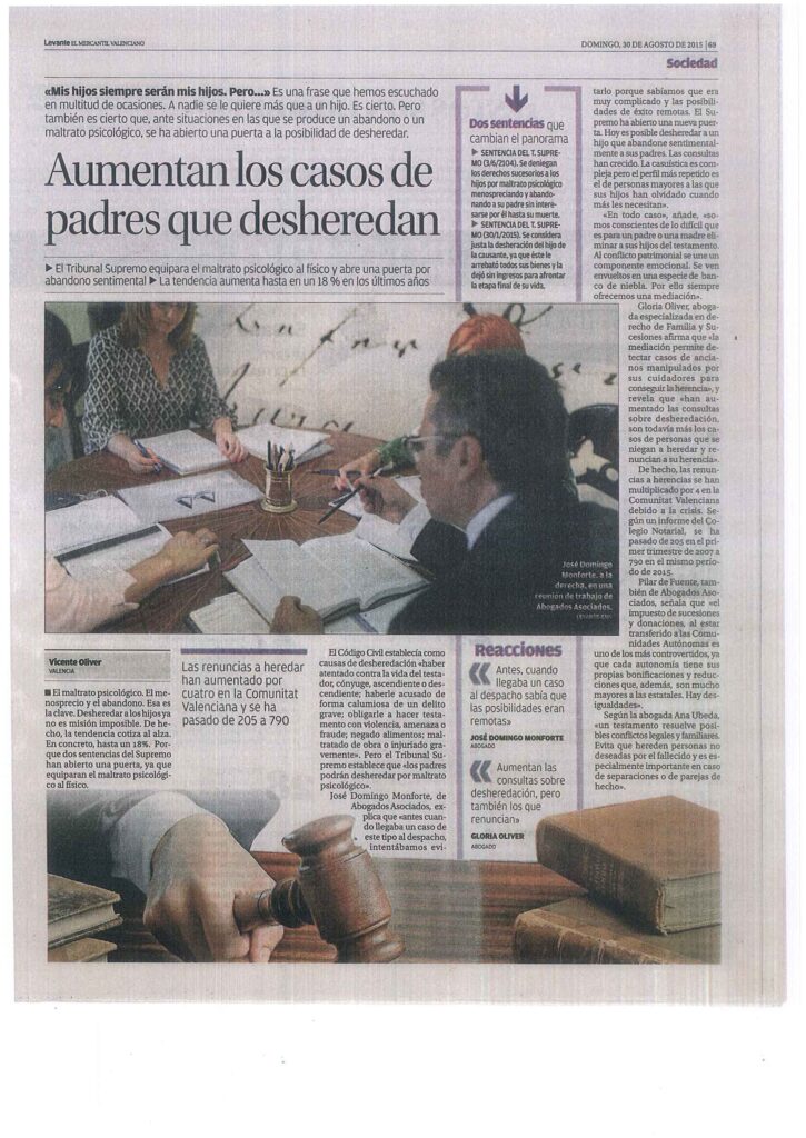 El área de familia y sucesiones del despacho José Domingo Monforte Abogados Asociados entrevistada por Levante en relación a la desheredación.