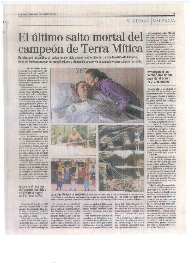 Rafal ha iniciado una reclamación frente a la Mutua para que se haga cargo de las prestaciones medicas, y su abogado, José Domingo Monforte, valora presentar acciones de responsabilidad laboral empresarial por las circunstancias que pudieron intensificar el riesgo de la actividad que practicaba. «Ahora se está en conversaciones muy avanzadas con la dirección de Terra Mítica que, aunque no asume responsabilidad en los hechos, se muestra sensible a dar cobertura a las necesidades y tratamiento terapéutico y quirúrgico que permita que Rafal gane en funcionalidad y mejore su calidad de vida», aclara José Domingo.