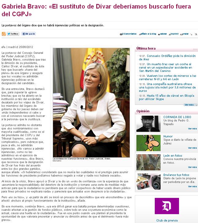 La portavoz admite no obstante que «los nombramientos con mayoría cualificada», como es el del presidente del CGPJ y del Tribunal Supremo, «son más complicados», pero subraya que, pese a ello, no admitirán injerencias. «No vamos a admitir injerencias, como no las admitimos en el ejercicio de nuestras funciones», dice Bravo, que reconoce que la designación de Dívar fue fruto del acuerdo entre los dos grandes partidos, aunque añade: «Si hubiéramos considerado que no reunía las cualidades ni el prestigio para asumir las funciones de presidente podíamos habernos negado a votar y nadie nos hubiera cesado».