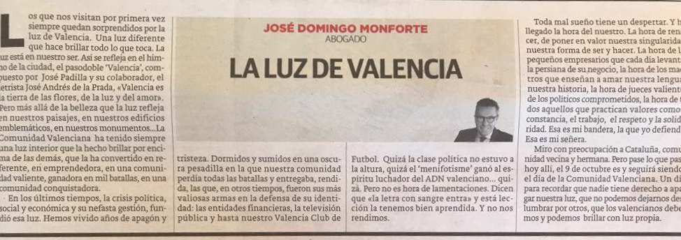 La luz de Valencia. Un artículo de José Domingo Monforte. Abogado. Publicado el 9 de Octubre de 2017 en Las Provincias. Día de la Comunidad Valenciana.