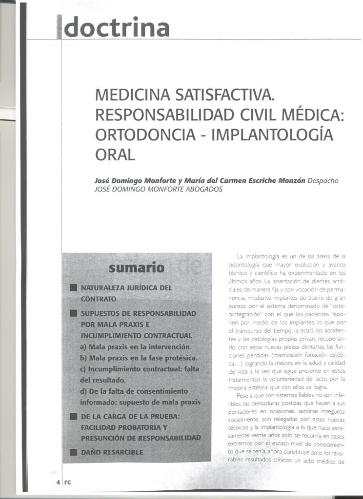 El estudio que nos proponemos abordar de la cuestión, viene referido a la responsabilidad profesional que puede exigirse, tanto en la Odontoestomatología como en la Implatología, por daños producidos en el ámbito y realización de su actividad, ante intervenciones no curativas, terapéuticas o asistenciales, esto es, en supuestos de medicina voluntaria o satisfactiva que, en sus dos facetas de estética y preventiva, se caracterizan porque la persona o el interesado –que no paciente, dado que no existe propiamente una enfermedad-, acude al médico no para la curación de una patología, sino para mejorar su aspecto físico o estético, siendo en estos casos, plenamente voluntaria la asistencia sanitaria y absolutamente libre la relación entre el facultativo y la persona que solicita su intervención, en tanto no resulta impuesta por un deterioro de salud que la convierta en necesaria.