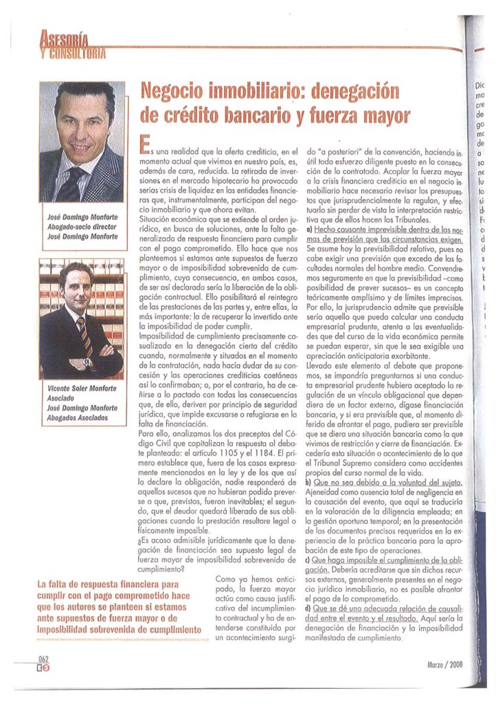 Como ya hemos anticipado, la fuerza mayor actúa como causa justificativa del incumplimiento contractual y ha de entenderse constituida por un acontecimiento surgido a posteriori de la convención haciendo inútil todo esfuerzo diligente puesto en la consecución de lo contratado. Acoplar la fuerza mayor a la crisis financiera crediticia en el negocio inmobiliario hace necesario revisar los presupuestos que jurisprudencialmente la regulan, y hacerlo sin perder de vista la interpretación restrictiva que de ellos hacen los Tribunales.
