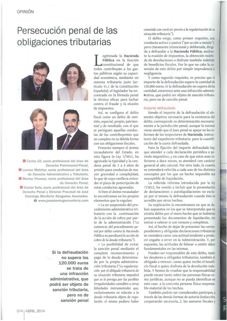 Autores: Carles Gil Gimeno, Socio profesional del área de Derecho Patrimonial-Penal. Lorena Melchor Llopis, Socia profesional del área de Derecho Administrativo y Tributario. Marisa Vinuesa Galiano, Socia profesional del área de Derecho Penal. Daniel Sala Paños. Socio profesional del área de Derecho penal y Director procesal del despacho DOMINGO MONFORTE ABOGADOS ASOCIADOS