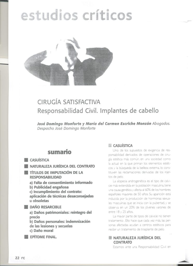 Uno de los supuestos de exigencia de responsabilidad derivados de operaciones de cirugía estética más común, en una sociedad como la actual en la que priman los elementos estéticos y la búsqueda de la belleza externa, lo constituyen las reclamaciones derivadas de los injertos de pelo.