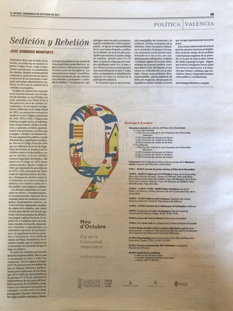 Sedición y Rebelión. Un artículo de José Domingo Monforte. Penal. Publicado en El Mundo el 8 de octubre de 2017.
