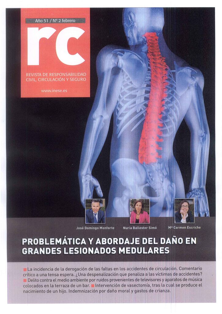 Un artículo del despacho José Domingo Monforte Abogados Asociados es portada, este mes de febrero, de la revista INESE, la publicación más prestigiosa en el ámbito de la Responsabilidad Civil, Circulación y Seguro. Se trata de un ensayo sobre la problemática y el abordaje del daño en grandes lesionados medulares. Lo firman el director del despacho José Domingo Monforte y las abogadas asociadas Nuria Ballester Simó y MªCarmen Escriche Monzón.