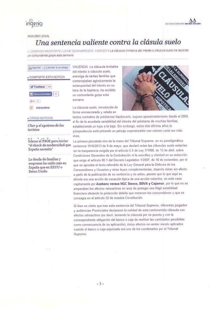 LA RUPTURA DEL SUELO FINANCIERO. VALIENTE SENTENCIA DE LA AUDIENCIA PROVINCIAL DE VALENCIA.Valencia Plaza. 14.6.2014.